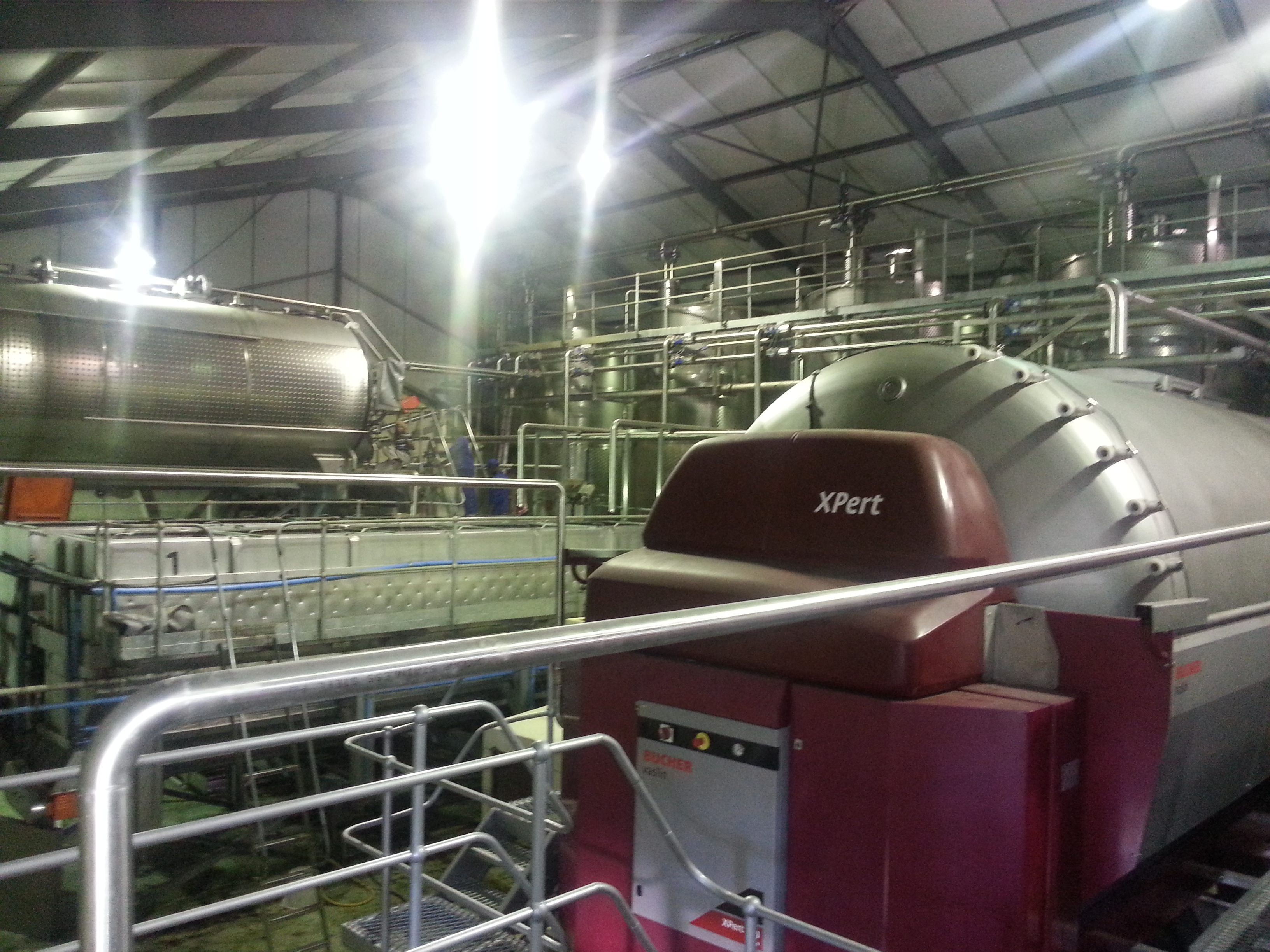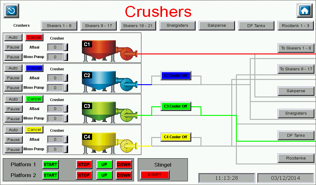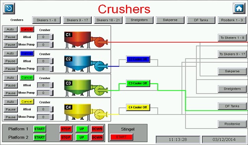 Intake HMIAn HMI screenshot of a grape intake system used in a winery. The PLC is able to control the intake machinery as well as the valve system used to distribute the grapes to various seperators, presses, and storage tanks -