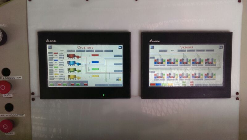 Intake HMIsA photo of the HMI's that the operator uses in order control the intake system. Note we connected two HMIs to one PLC network in order to be able to see an overview of multiple sections of the system during operation -