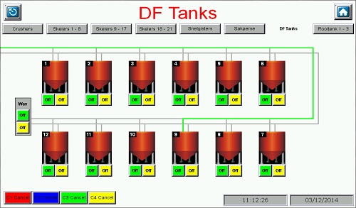 Intake HMI Storage TanksAnother screenshot of the grape intake system, showing an available path to one of the DF Tanks. The buttons under each tank allow the operator to select which intake they would like to route the grapes from to get to that specific tank -