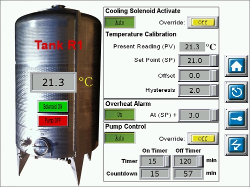 Wine Cooling SystemAn HMI screenshot of a red wine circulation system. A PLC was used to control the cooling solenoids to maintain a certain temperature in the tanks, while also turning on the circulation pumps at set time intervals. Monitoring and parameters for multiple tanks could be viewed and altered from one single HMI unit -